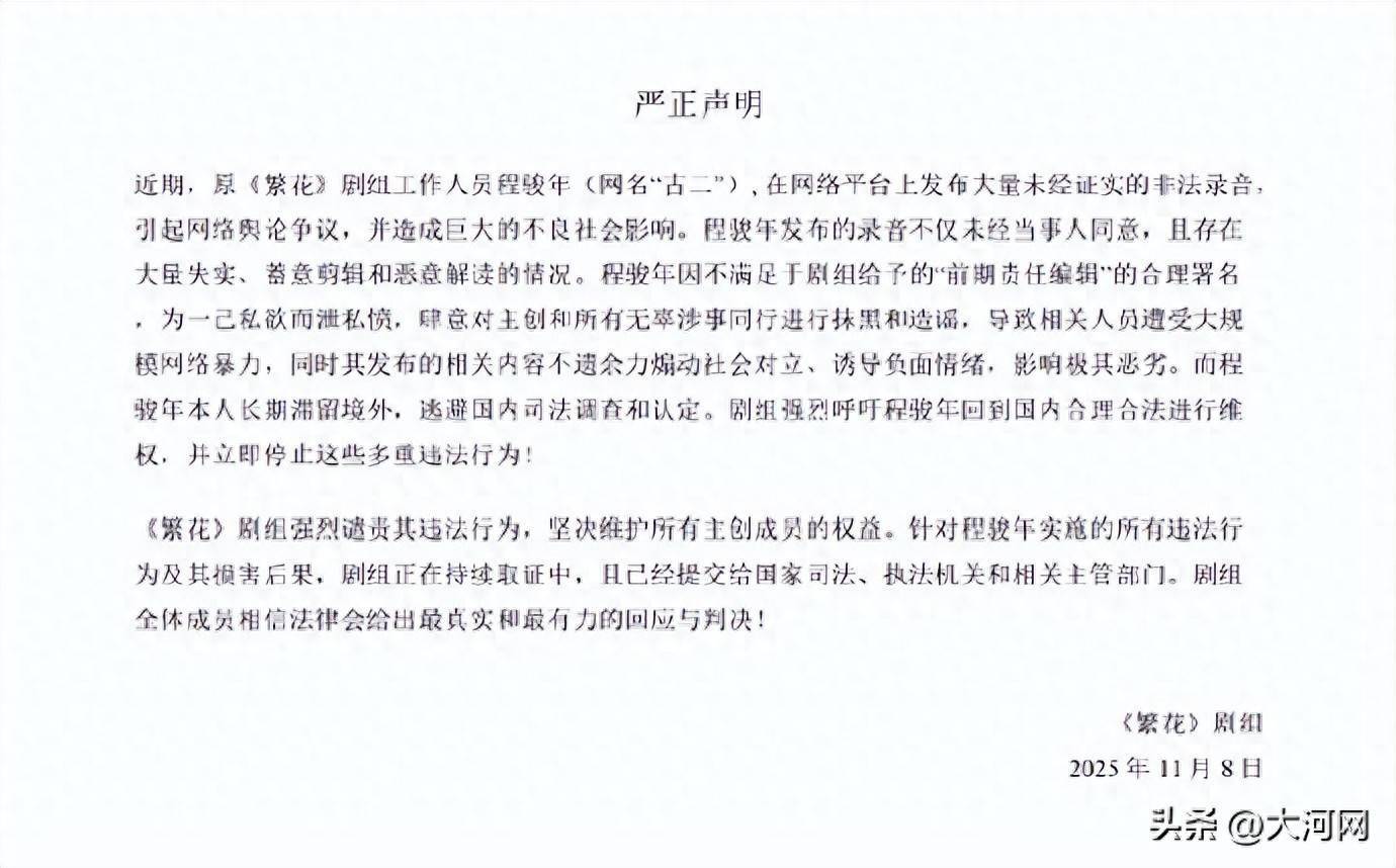 近期,原《繁花》剧组工作人员程骏年(网名 “古二”),在网络平台上发布大量未经证实的非法录音,引起网络舆论争议,并造成巨大的不良社会影响。程骏年发布的录音不仅未经当事人同意,且存在大量失实、蓄意剪辑和恶意解读的情况。程骏年因不满足于剧组给予的 “前期责任编辑” 的合理署名,为一己私欲而泄私愤,肆意对主创和所有无辜涉事同行进行抹黑和造谣,导致相关人员遭受大规模网络暴力,同时其发布的相关内容不遗余力煽动社会对立、诱导负面情绪,影响极其恶劣。而程骏年本人长期滞留境外,逃避国内司法调查和认定。剧组强烈呼吁程骏年回到国内合理合法进行维权,并立即停止这些多重违法行为!